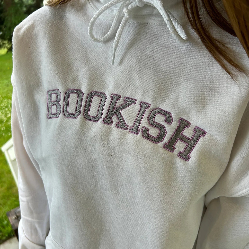 Show off your love for reading in style. This cozy hooded sweatshirt features “Bookish” embroidered across the front in a bold two-color font, giving it a pop of personality that’s perfect for any book lover.