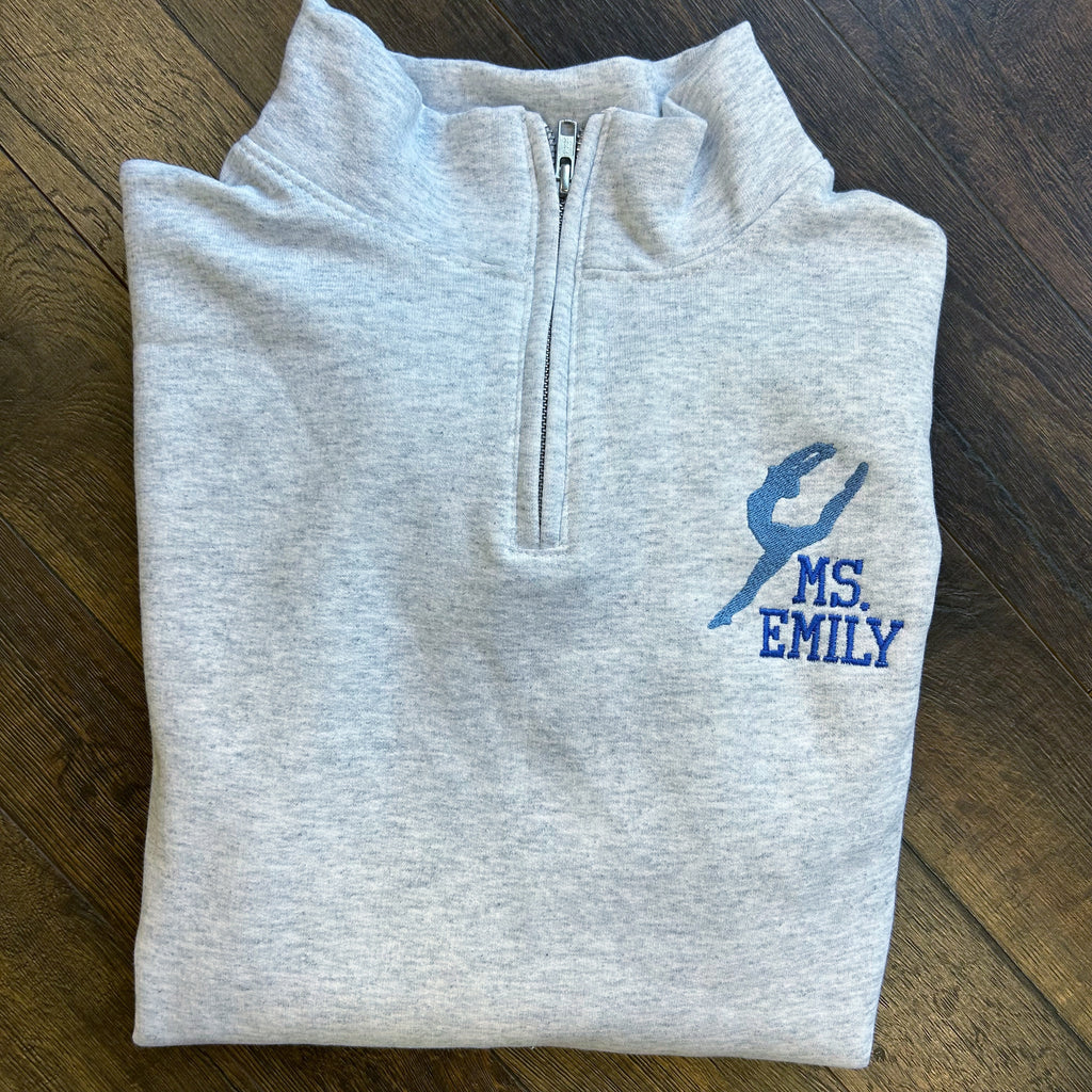 Designed with comfort and style in mind, this cozy quarter zip sweatshirt is perfect for dance teachers on the go. Embroidered on the left chest with a graceful dancer graphic and the teacher’s name, it adds a personalized touch to your everyday studio wear. Whether you're leading warmups, choreographing routines, or heading to class, this midweight pullover keeps you warm, polished, and ready to move.