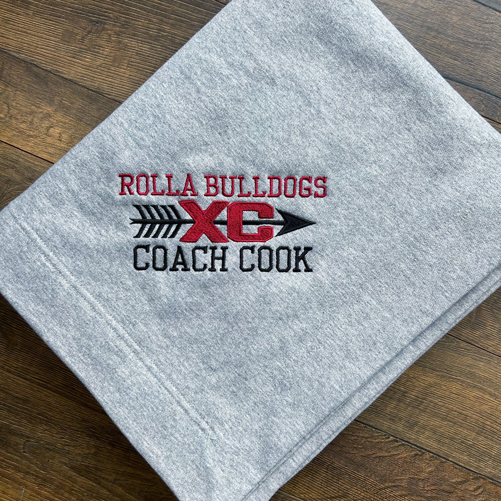 Show your team pride and stay cozy with this custom stadium sweatshirt blanket, embroidered with a cross country design, team name, and coach’s name in the corner. Made from soft, heavyweight sweatshirt fleece, it’s perfect for chilly meets, travel days, or relaxing after a long run.