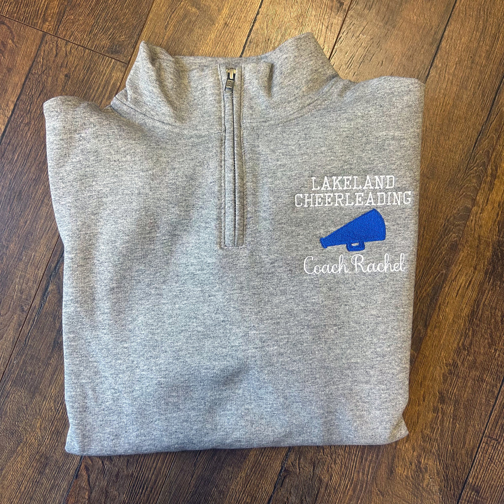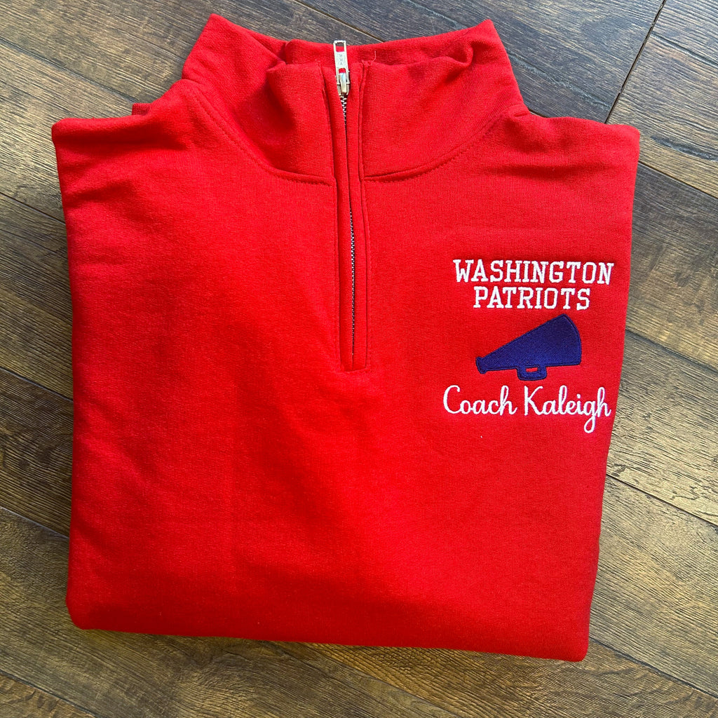Stay stylish and show your team pride with this quarter-zip sweatshirt featuring a bold megaphone design. The team name and coach's name are embroidered on the left chest for a personalized touch. Perfect for coaches, players, and fans who want comfort and a professional look, both on and off the field.