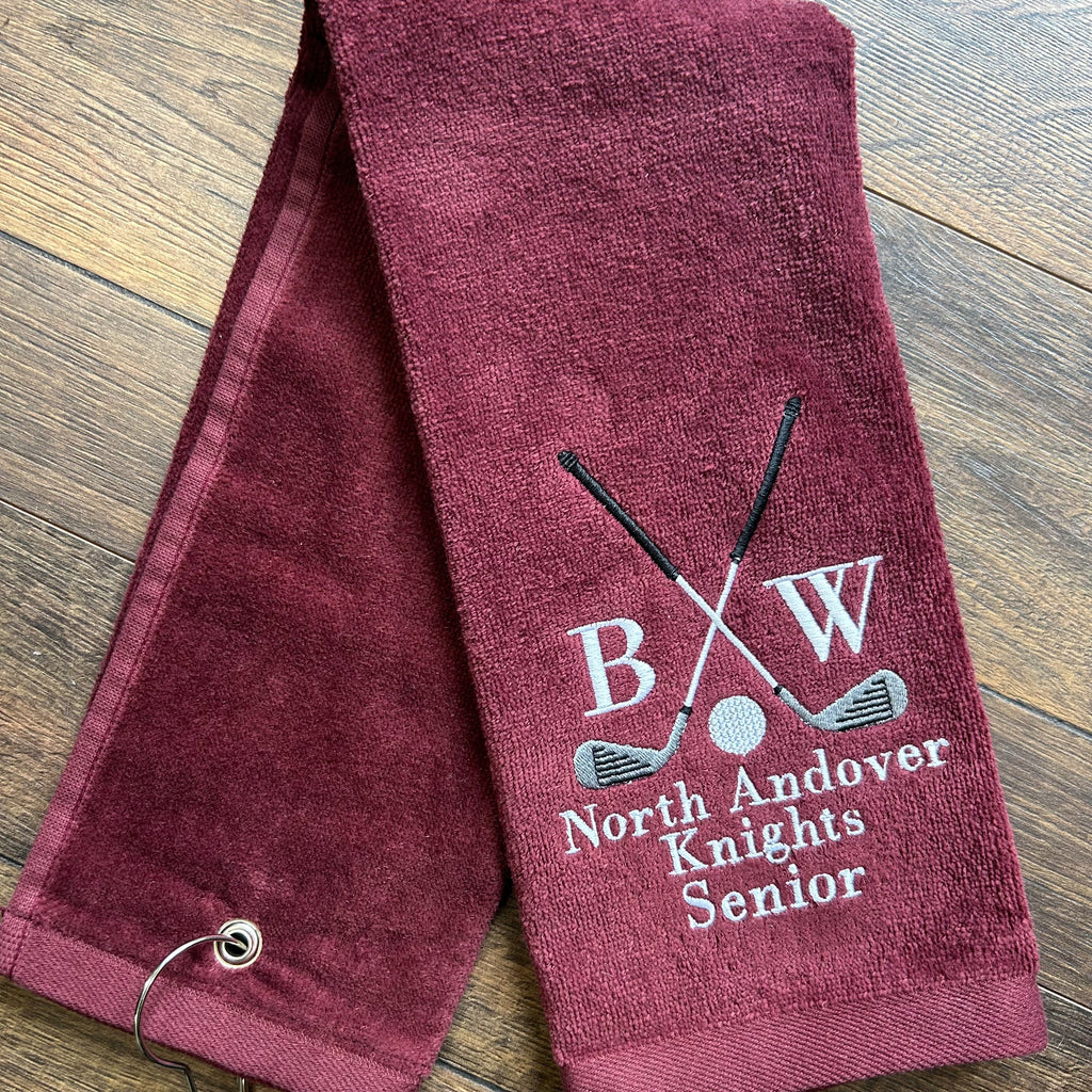 Personalized golf towels that every golf team needs. Great way to celebrate the beginning of the golf season or the end of it! Also makes a great gift for any graduating senior. Help them to remember their time on the golf team. Golf towel comes with a golf club design, initials and team name in embroidery at the bottom of the towel.