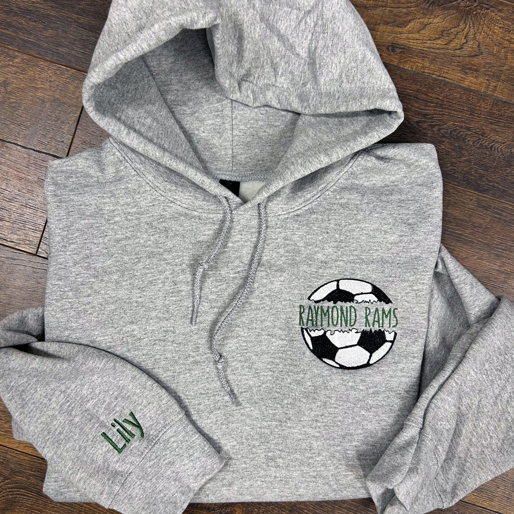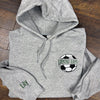 Show your team pride in comfort and style with this personalized hooded sweatshirt. It features a unique split soccer ball and your team name embroidered on the left chest, plus your player’s name stitched neatly on the sleeve near the cuff. Made from soft, durable fabric that keeps you warm on and off the field, this hoodie is perfect for players, coaches, and fans alike. A great way to represent your team with a personal touch.