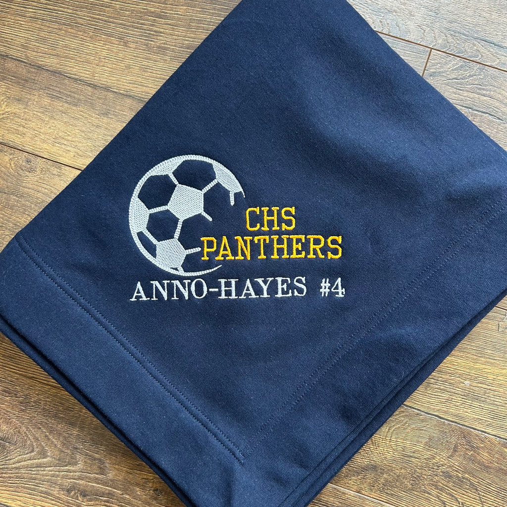 Great blanket to use while you are out at a game or makes a great gift for any soccer player! Also makes a great gift idea for any seniors on the team or end of season gift. This sweatshirt blanket is warm and cozy. Blanket comes with soccer ball, team name, and player name embroidered on the corner of the blanket.