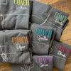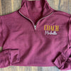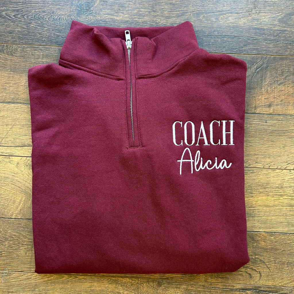 Stand out on and off the field with this custom embroidered quarterzip sweatshirt made just for coaches! Designed with COACH in bold block uppercase letters and your name in elegant cursive embroidery underneath, this pullover is the perfect blend of professional and personal.