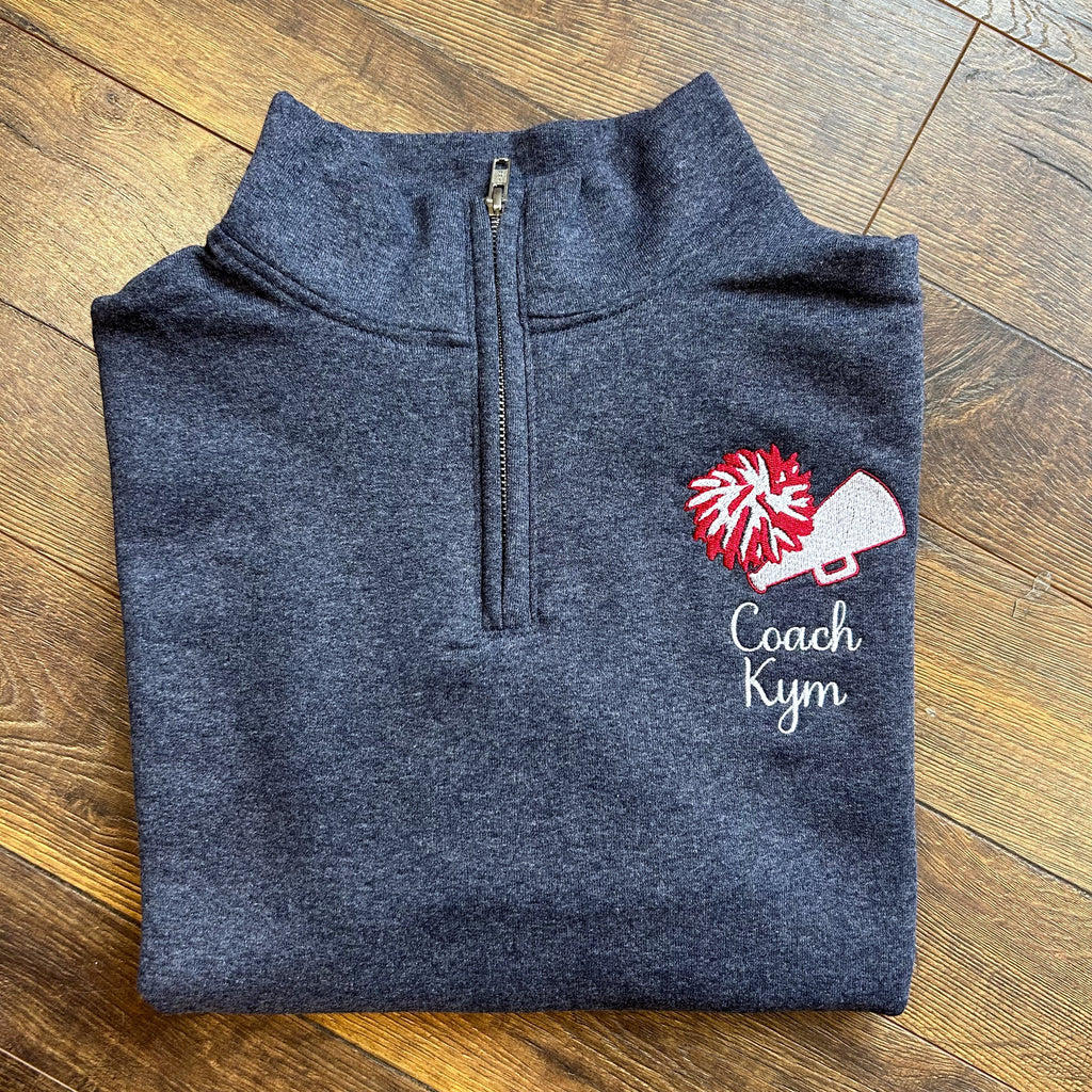 Cheer coaches need their own swag too! This coaches sweatshirt will sure to be a hit with any cheer coach. Perfect gift idea for coach that loves cheerleading. Sweatshirt comes with Coach's name and cheerleading design embroidered on the left chest.