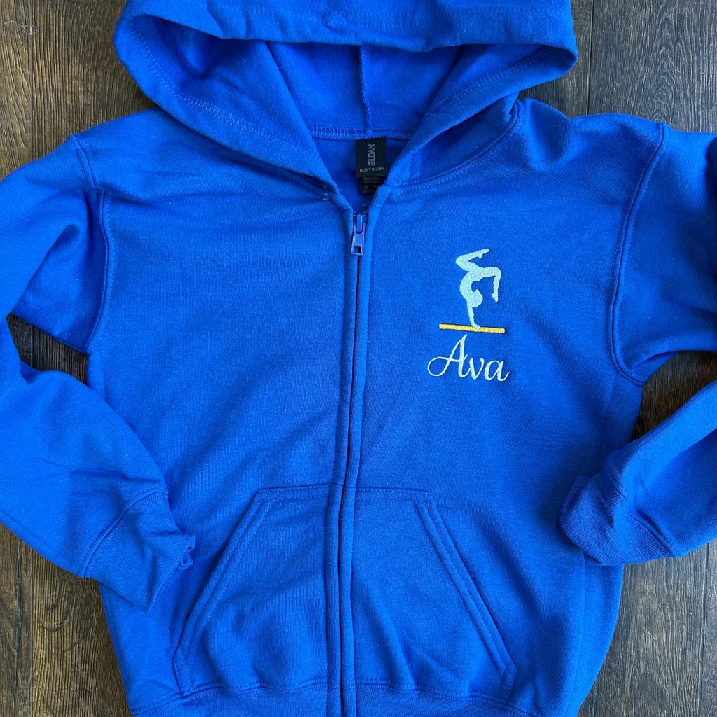 Elevate your young gymnast's style with our personalized zip-up hoodie. Featuring a sleek gymnastics design, this hoodie is crafted for comfort and movement. The gymnast's name is elegantly embroidered on the left chest, making it a unique and cherished piece for every practice session or casual day out.
