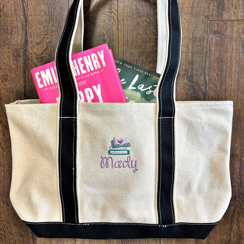 Carry your current reads in style with this sturdy canvas tote bag featuring a charming embroidered stack of books and your name on the side. Perfect for book club meetups, library runs, or everyday errands, this tote is made for book lovers who always have a few titles in tow. Functional, personal, and full of literary charm—it's the ultimate reader’s companion.