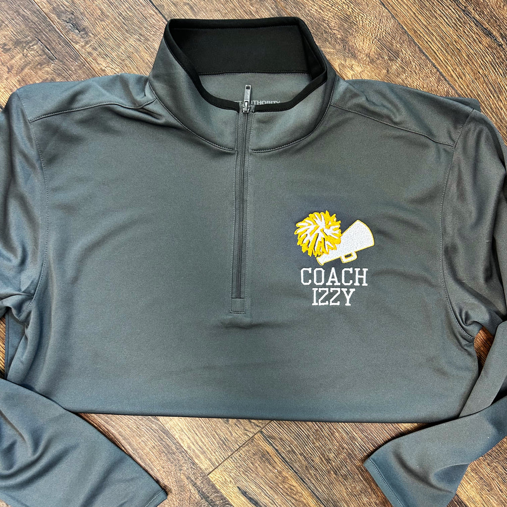 Cheer in style and comfort with this long sleeve performance quarter zip pullover made just for coaches. Featuring an embroidered cheer design with pom poms and a megaphone plus the coach’s name on the left chest, it’s the perfect blend of personalization and function. The lightweight moisture wicking fabric keeps you cool and dry through practices, games, and competitions while the athletic fit ensures a polished look from sidelines to team meetings.